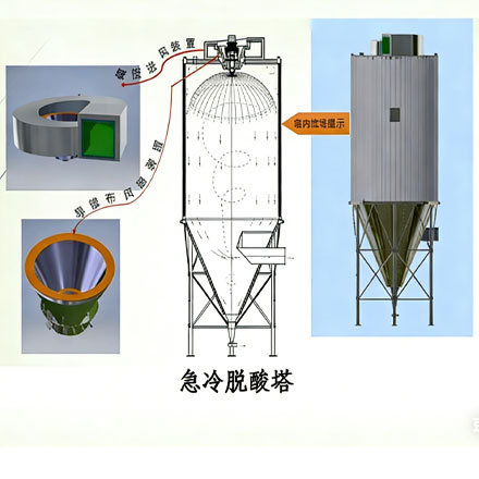 本多功能脱酸塔是为危废焚烧处理烟气净化而定制设计,能实现急冷、脱酸、干化、分离等功能。作为烟气净化主要单元设备,它的使用缩短了烟气净化工艺流程,提高了生产运行效率。急冷脱酸塔装置主要组成:螺旋进风装置、导锥布风器装置、旋转雾化机喷雾装置、塔主体、监测控制装置等急冷脱酸塔装置设备特点:与高温烟气接触的-螺旋进风装置、导锥布风器装置、旋转雾化机防护置表面,均采用陶瓷涂层结构进行防腐蚀保护。