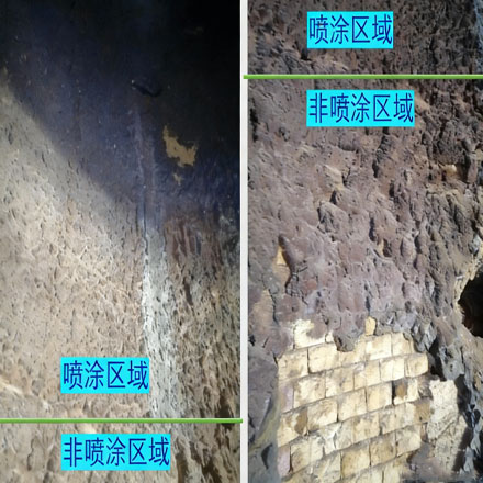 喷涂效果:①可以明显降低浇注料表面结焦量,喷涂后设备运行产生的结焦会自动脱落,无大块结焦,易清焦;②防止浇注料长期在高温下的氧化腐蚀,有效提高浇注料的使用寿命;③喷涂层功能可持续3年以上,是产线长周期运行保障。