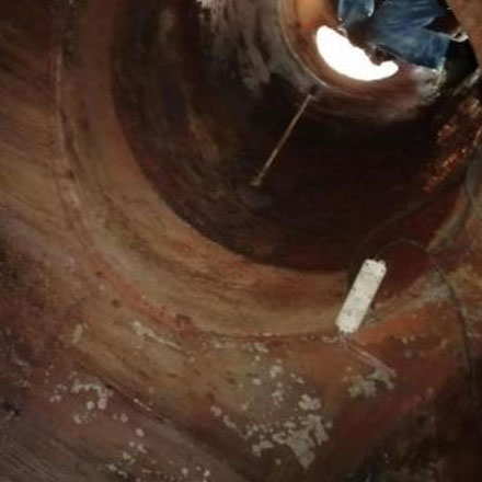 工况介绍:温度120℃~140℃,基体材料普通钢板。进口烟道保温层漏风等因素,局部部位温度低于酸性烟气露点温度和水露点温度,形成酸液腐蚀烟道钢板。